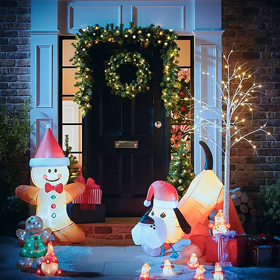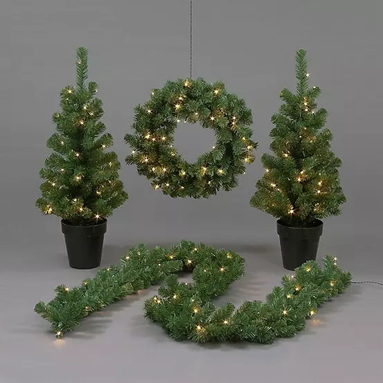 The set contains 2 x LED 90cm trees, 1 x 60cm LED Wreath and 1 x 270cm LED Garland. Easily dress your front door this year.