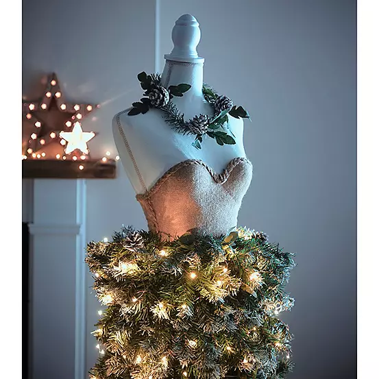How stunning is this Christmas Tree! You don’t even have to decorate it. A natural jute style bodice covers the top of the mannequin with a full skirt of frosted pine sprigs, decorated with pinecones and Eucalyptus leaves. Complete with the co ordinated and removeable necklace, should you wish to display your own decoration. The only addition we made is to add some warm LED lights to the skirt. These are not included, allowing you to add your own lighting, or not, the choice is yours. A real talking point for your home this Christmas time.