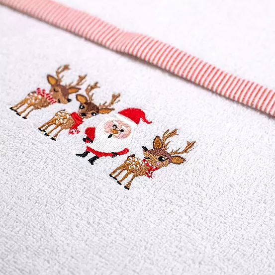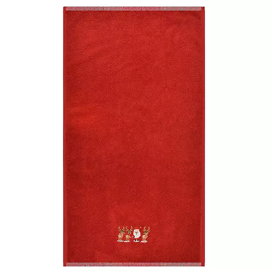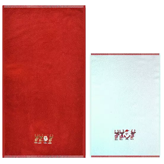 Fabulous festive towel set featuring embroidered Santas. The set comprises a red hand towel and a white guest towel.