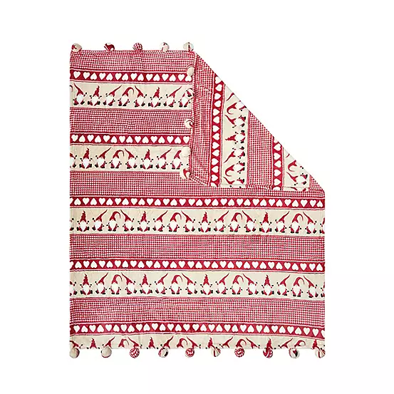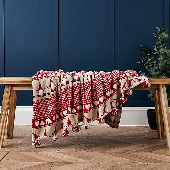 Printed Gonk and heart super soft Christmas throw with 20 pom poms.