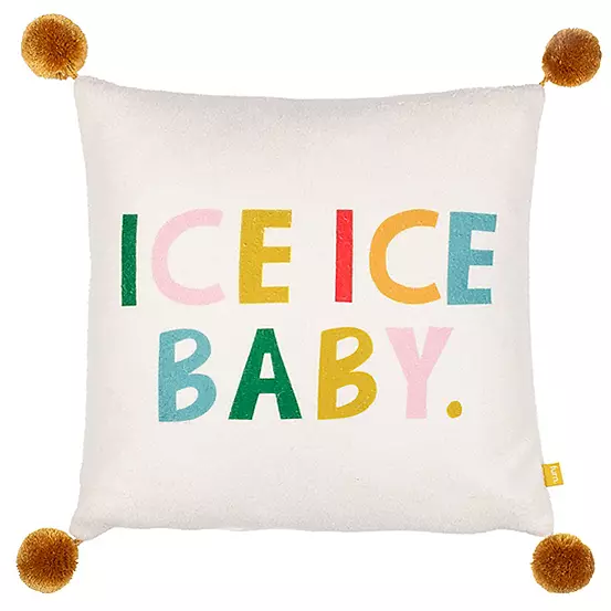 Add a touch of seasonal personality to your home with our Ice Baby cushion. The multi-coloured letters are printed onto soft boucle fabric, complimented by a plain reverse. Finished with big round pom-poms on each corner and a zip fastening. Ideal for adding a bit of fun to your soft furnishings.