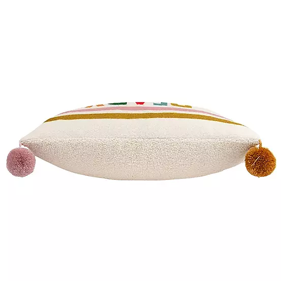 Add some fun to your soft furnishings this winter with our Ready Set Snow cushion. The letters are printed onto soft boucle fabric, with multi-coloured stripes and complimented by a plain reverse. Finished with big round pom-poms on each corner and a zip fastening. Ideal for adding a bit of fun to your home.