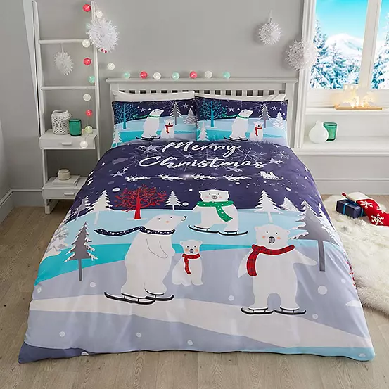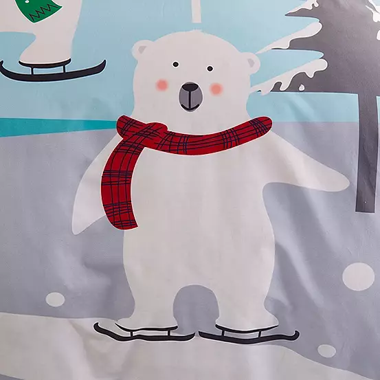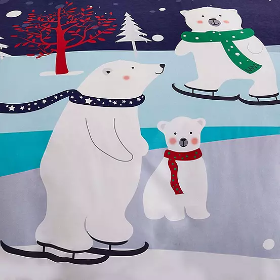 These rosy-cheeked polar bears are out for some festive fun, skating across the bed and into your dreams! With a deep blue night sky revealing the stars at their twinkling best, this is snuggly bedtime comfort in easy care poly cotton – a treat for seasonal bedtimes! The duvet set includes one pillowcase with the single and two with the double and king.