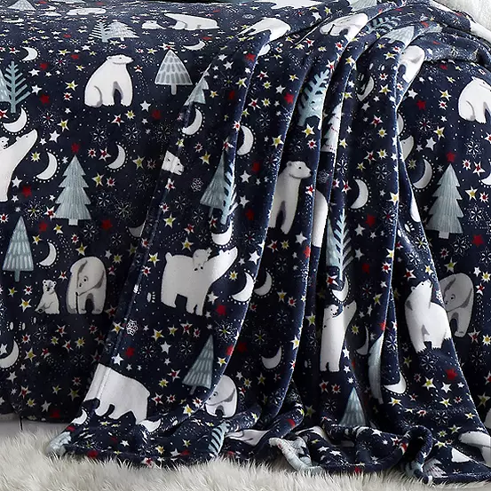 A cute family of polar bears stroll happily across this stunning night-time scene throw from Fusion. Printed onto an incredibly soft and cosy fleece fabric, you can take this throw and lay it on your bed for some extra warmth or to keep you snuggly on the sofa, car or anywhere in fact where you want to add a touch of colour and cosiness.