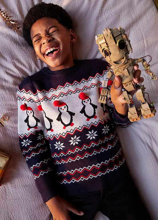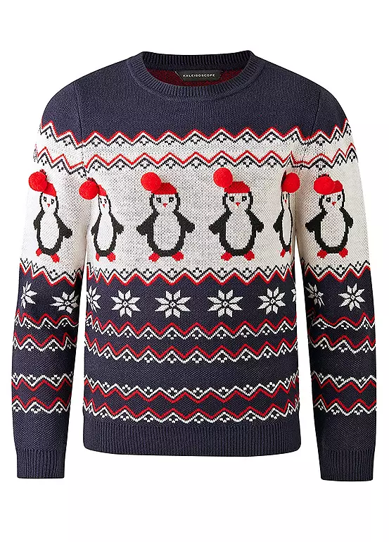 Tis the season! Introducing our festive novelty family knit. In two colourways with a cute penguin design and 3D pom poms. this unisex festive jumper also has a matching adult jumper and one for the dog too. Ideal for festive trips out, this jumper will have you feeling merry for the festive season. Matching Hat available.