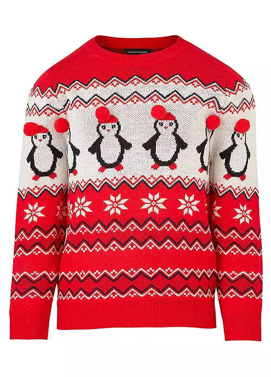 Tis the season! Introducing our festive novelty family knit. In two colourways with a cute penguin design and 3D pom poms. this unisex festive jumper also has a matching adult jumper and one for the dog too. Ideal for festive trips out, this jumper will have you feeling merry for the festive season. Matching Hat available.