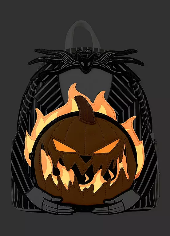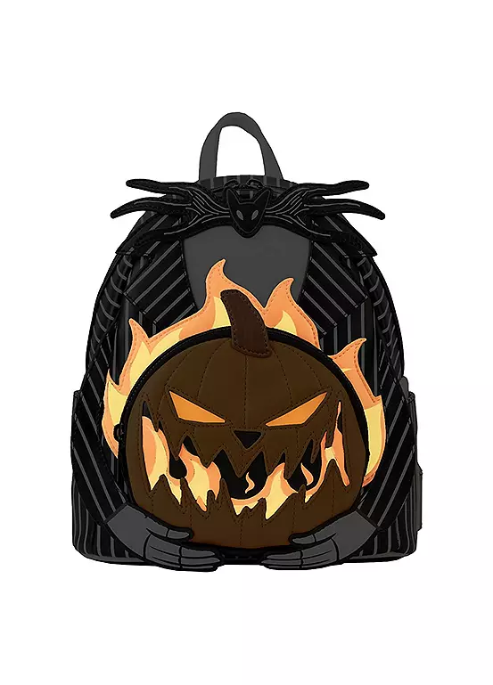 Sweep even the bravest off their feet with the Loungefly Nightmare Before Christmas Jack Pumpkin Head Mini Backpack! Taking the form of the Pumpkin King himself, the front of this accessory shows Jack Skellington as he treats the citizens of Halloween Town to a scare. A winged bat bowtie accompanies his frighteningly stylish pinstripe suit, and he holds a flaming jack-o’-lantern in his hands below. Dare to look behind the pumpkin’s wicked grin and you’ll discover a hidden zipper pocket to hold your treats. As daylight fades, the pumpkin’s flames illuminate the night with glow-in-the-dark details. A haunting addition to any outfit, this mini backpack is a scream for any fan of Disney Tim Burton’s The Nightmare Before Christmas.