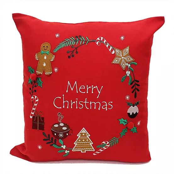 Bring some fun, festive cheer to your home with these gorgeous Christmas wreath cushions featuring stunning embroidery on a striking red background.