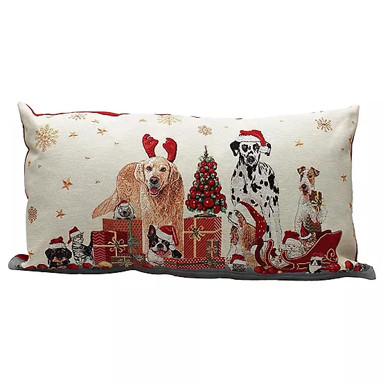 This extra long, woven tapestry style cushion, with plain reverse and zip fastening features an array of adorable animals dressed in their Christmas best will add a touch of fun and personality to your decor.
