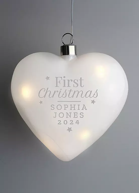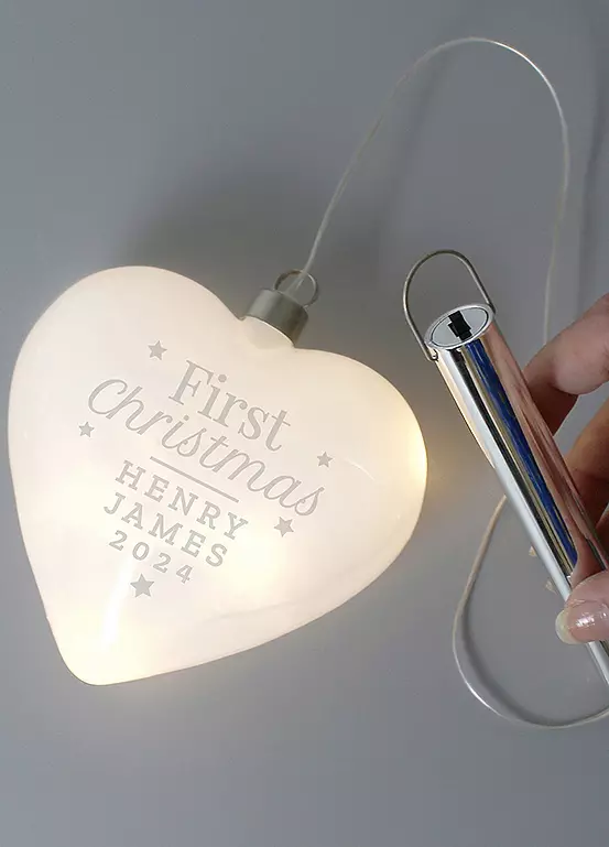 This modern personalised gift is perfect for babies first Christmas. Personalise this LED glass heart with up to 3 lines of 15 characters per line (including spaces and punctuation). Personalisation will appear in fixed uppercase. ’First Christmas’ is fixed text. Material is glass (hand blown). On/off switch to save batteries, simply slide the battery compartment from the silver tubing to place your batteries in, the LED light can now be hung up and used as a decoration or a nightlight.