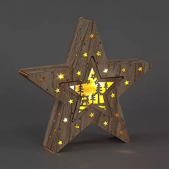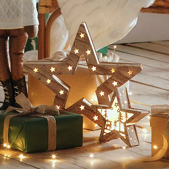 Set of LED 2 wooden stars. The smaller star perfectly fits inside the bigger one, giving you two ways to display your new Christmas decoration. The pair look great styled on a windowsill or mantle.
