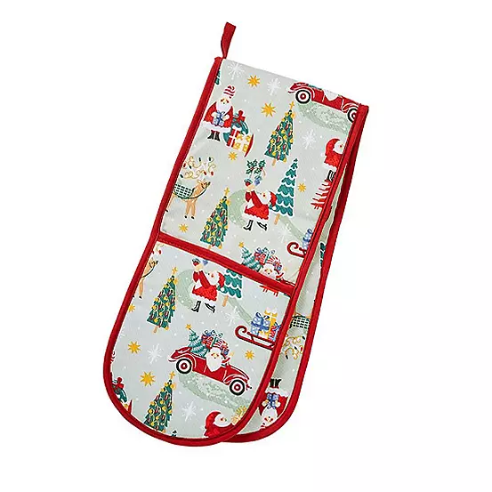 Nothing says Christmas quite like this spectacular Christmas scene! Gifts, Christmas tree’s, sleighs, reindeer, Santa and his bright red sports car! Beautifully designed by Mona. The sage-green background in bang on trend and sets off each element to perfection. Crisp white napkins featuring a reindeer and a gift laden sleigh, will steal the show on any Christmas table. Whether oven gloves or micro mitts are your armour of choice, or doing the dishes are more your domain, all the stresses of your Christmas banquet will be quickly forgotten as you strap on this festive apron. Indeed, Tis The Season with this fun, family friendly collection.